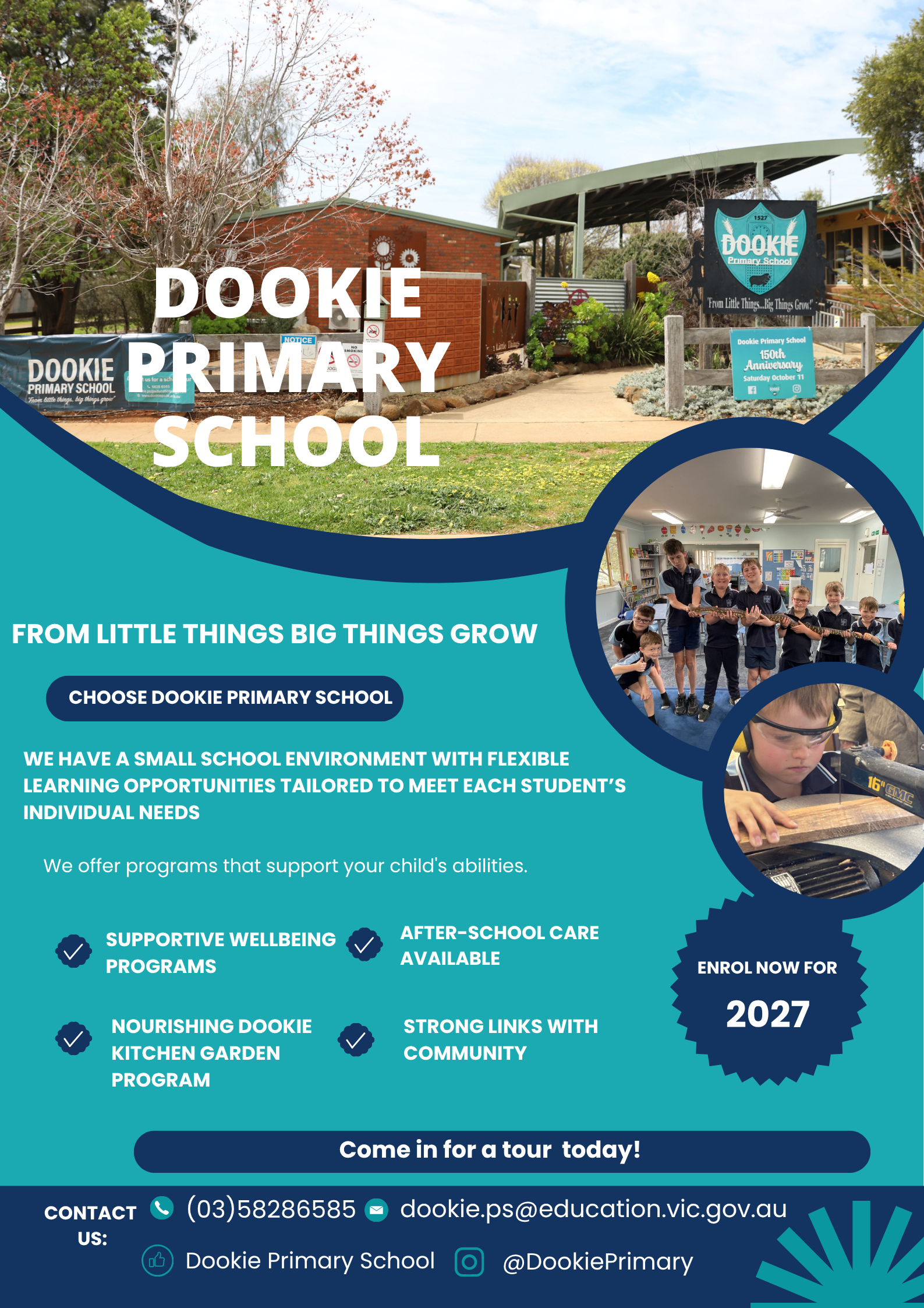 The focus for these sessions is to prepare children and families for the next stage of learning. Teaching staff have designed sessions that will provide children with a glimpse of the school environment. Children will also get to become acquainted with staff, new peers and other students who already attend Dookie Primary School.